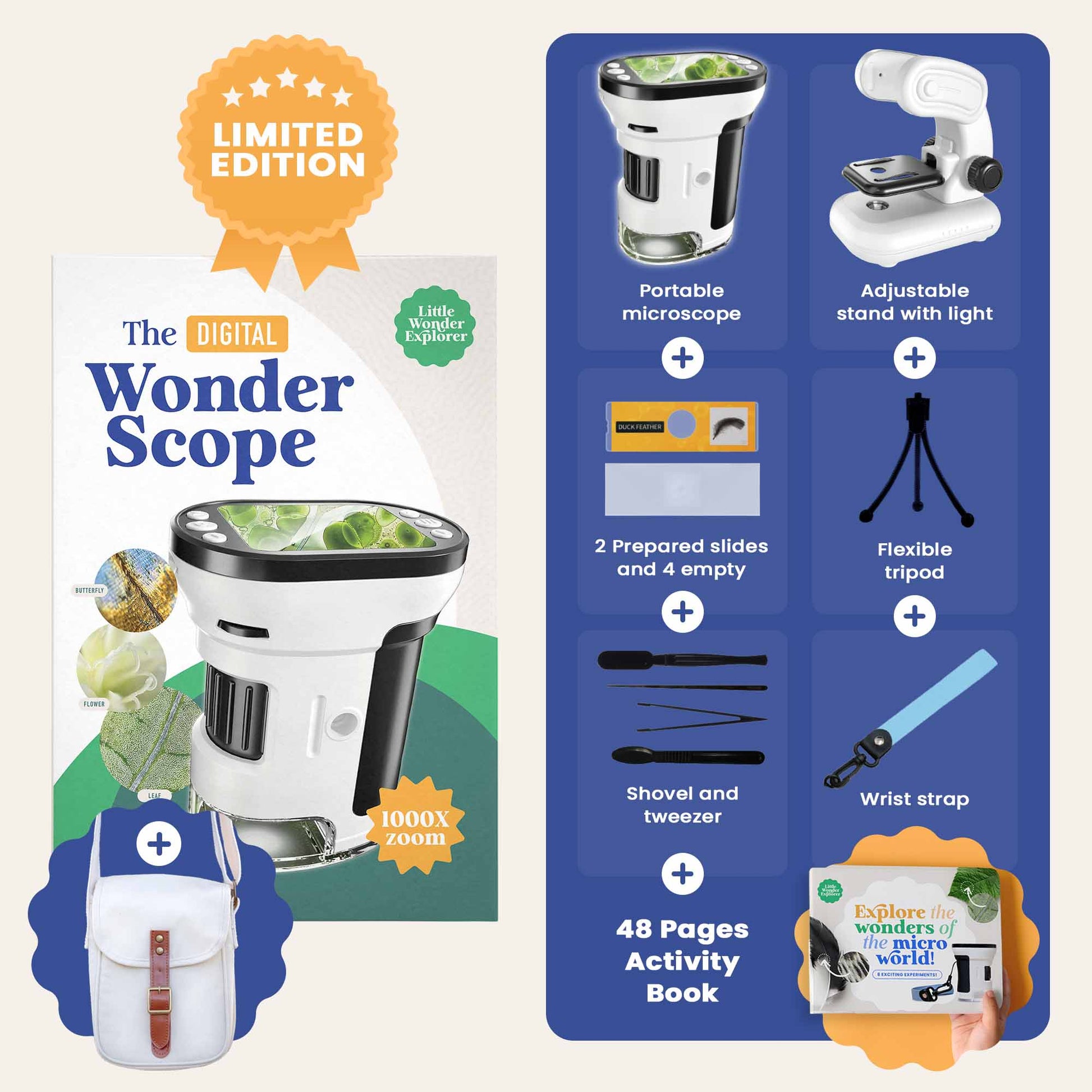 The WonderScope™ is built to be both durable and practical for young explorers. Designed with Premium ABS Plastic, it’s sturdy enough to withstand curious little hands. The high-quality optical lenses are securely protected to ensure long-lasting use.